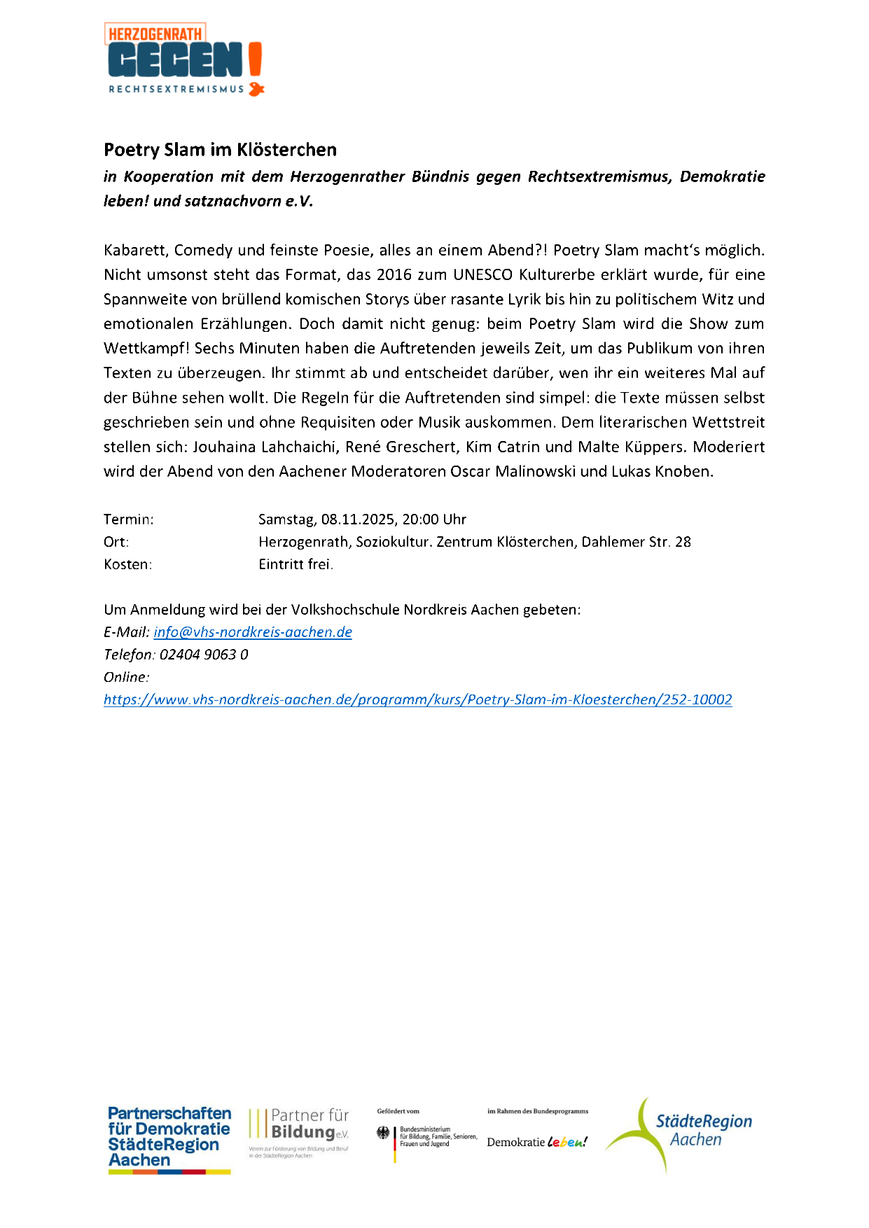 8.11.2025 Poetry Slam im Kösterchen in Herzogenrath Poetry Slam im Klösterchen in Kooperation mit dem Herzogenrather Bündnis gegen Rechtsextremismus, Demokratie leben! und satznachvorn e.V. ......................... Dem literarischen Wettstreit stellen sich: Jouhaina Lahchaichi, René Greschert, Kim Catrin und Malte Küppers. Moderiert wird der Abend von den Aachener Moderatoren Oscar Malinowski und Lukas Knoben. Beginn: 20:00Uhr Eintritt frei Im Klösterchen in 52134 Herzogenrath Soziokultur. Zentrum Klösterchen, Dahlemer Str. 28 Um Anmeldung wird bei der Volkshochschule Nordkreis Aachen gebeten: E-Mail: info@vhs-nordkreis-aachen.de Telefon: 02404 9063 0 Online: https://www.vhs-nordkreis-aachen.de/programm/kurs/Poetry-Slam-im-Kloesterchen/252-10002 ......................... Veranstalter: SJD-Die Falken, OV Merkstein, im Herzogenrather Bündnis gegen Rechtsextremismus www.sjd-die-falken-merkstein.info ......................... Information und Anmeldungen Siehe >>> Flugblatt S.1 Siehe >>> Flugblatt S.2 Siehe >>> PDF-Flugblatt