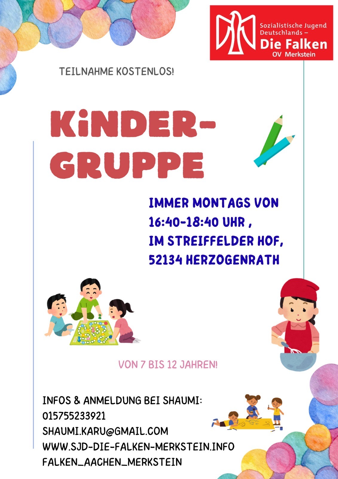 Montags: Kindergruppe in Merkstein Kindergruppe von 7 bis 12 Jahren immer Montags von 16:40-18:40Uhr Falkenraum im Streiffelder Hof, Merkstein 52134 Herzogenrath Teilnahme kostenlos Information und Anmeldungen bei Shaumi, Tel: 0157 552333921 shaumi.karu@gmail.com Instagram https://instagram.com/falken_aachen_merkstein Veranstalter: SJD-Die Falken, OV Merkstein www.sjd-die-falken-merkstein.info Siehe >>> Flugblatt Siehe >>> PDF-Flugblatt