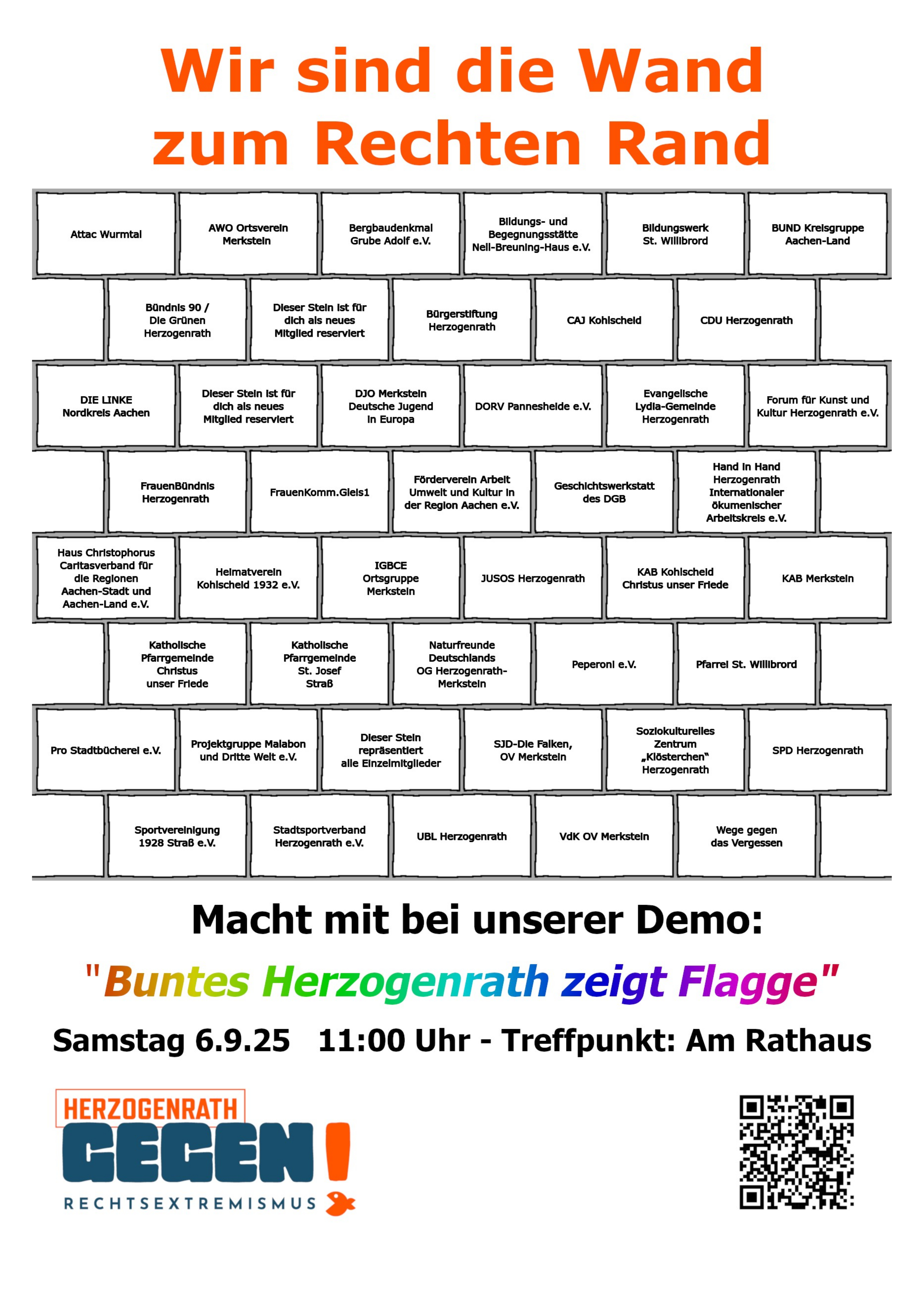 6.9.2025 Demonstration: "Buntes Herzogenrath zeigt Flagge" Wir sind die Wand zum Rechten Rand Macht mit bei unserer Demo am Samstag 6.9.2025 11:00 Uhr Treffpunkt am Rathaus Herzogenrath