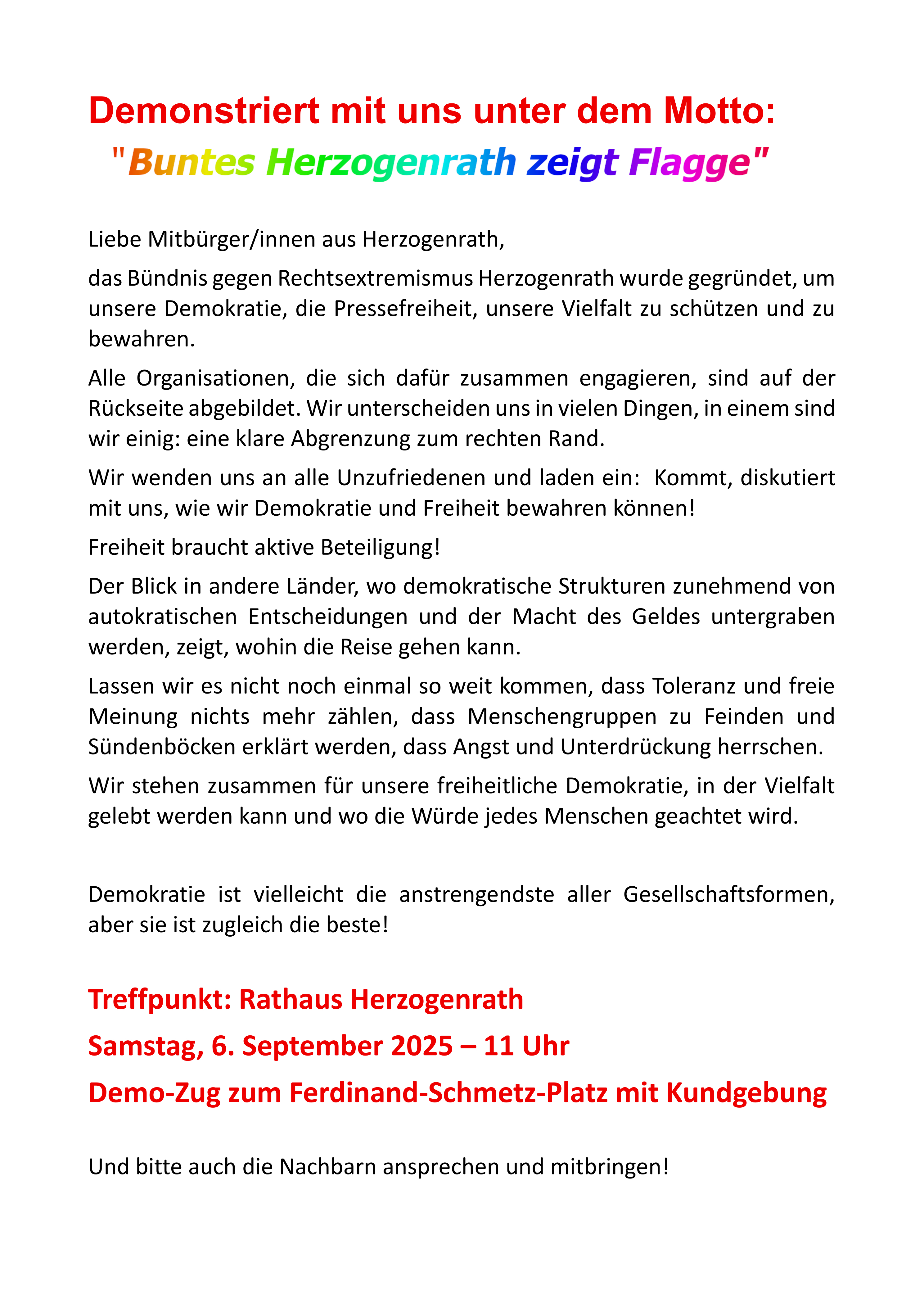 Demonstriert mit uns unter dem Motto: "Buntes Herzogenrath zeigt Flagge" Liebe Mitbürger/innen aus Herzogenrath, das Bündnis gegen Rechtsextremismus Herzogenrath wurde gegründet, um unsere Demokratie, die Pressefreiheit, unsere Vielfalt zu schützen und zu bewahren. Alle Organisationen, die sich dafür zusammen engagieren, sind auf der Rückseite abgebildet. Wir unterscheiden uns in vielen Dingen, in einem sind wir einig: eine klare Abgrenzung zum rechten Rand. Wir wenden uns an alle Unzufriedenen und laden ein: Kommt, diskutiert mit uns, wie wir Demokratie und Freiheit bewahren können! Freiheit braucht aktive Beteiligung! Der Blick in andere Länder, wo demokratische Strukturen zunehmend von autokratischen Entscheidungen und der Macht des Geldes untergraben werden, zeigt, wohin die Reise gehen kann. Lassen wir es nicht noch einmal so weit kommen, dass Toleranz und freie Meinung nichts mehr zählen, dass Menschengruppen zu Feinden und Sündenböcken erklärt werden, dass Angst und Unterdrückung herrschen. Wir stehen zusammen für unsere freiheitliche Demokratie, in der Vielfalt gelebt werden kann und wo die Würde jedes Menschen geachtet wird. Demokratie ist vielleicht die anstrengendste aller Gesellschaftsformen, aber sie ist zugleich die beste!